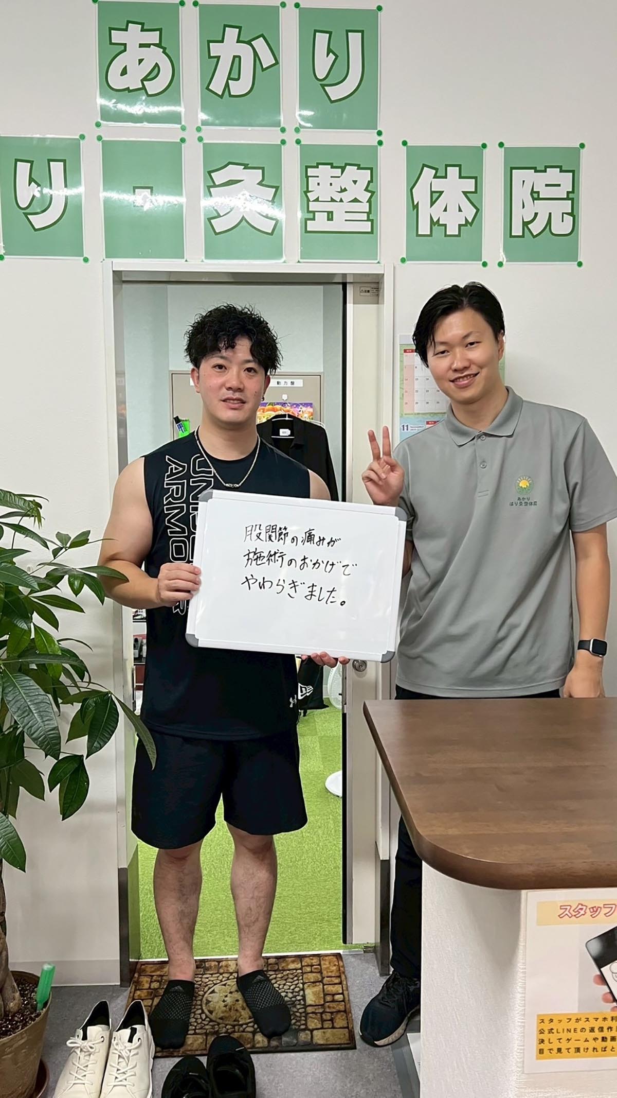 トレーニング中、股関節を痛めてストレッチなどいろいろ試してみましたが、改善されなかったため来院しました。整体をしていただき股関節が痛みが和らぎ、トレーニングも出来るようになりました。 (野田さん 30代男性 四日市市在住) ※効果には個人差があります |