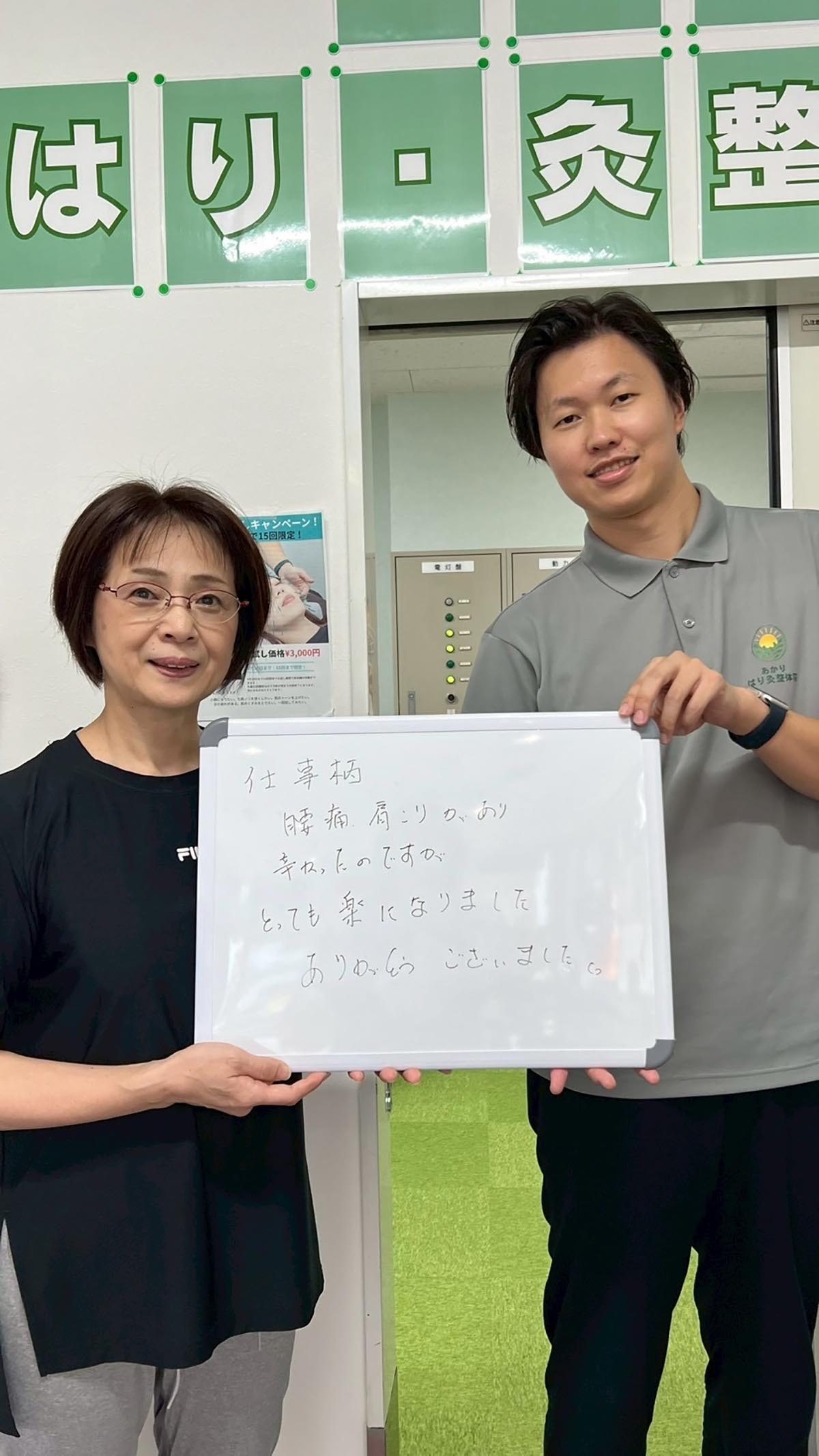 仕事柄、腰痛、肩こりがあり辛かったのですが、とっても楽になりました。ありがとうございました。 (神谷さん 50代女性 東海市在住) ※効果には個人差があります |